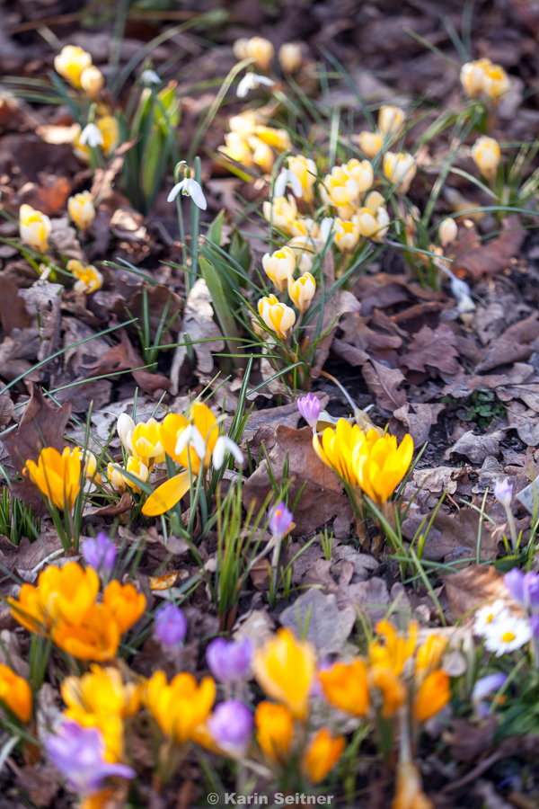 kleine gelbe, Krokus „Dorothy“ – botanisch und große gelbe, Name unbekannt, dazwischen lila sieberi „Fire Fly“ auch botanisch, die sollten sich alle prima vermehren, eingebuddelt habe ich genug 😀